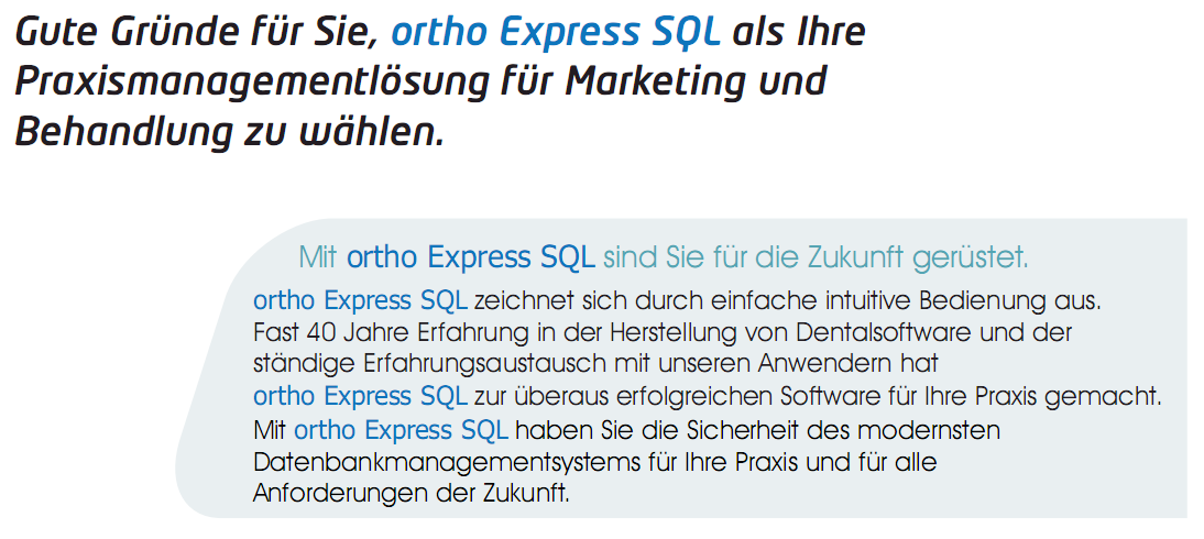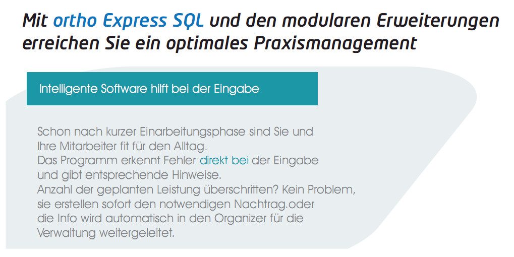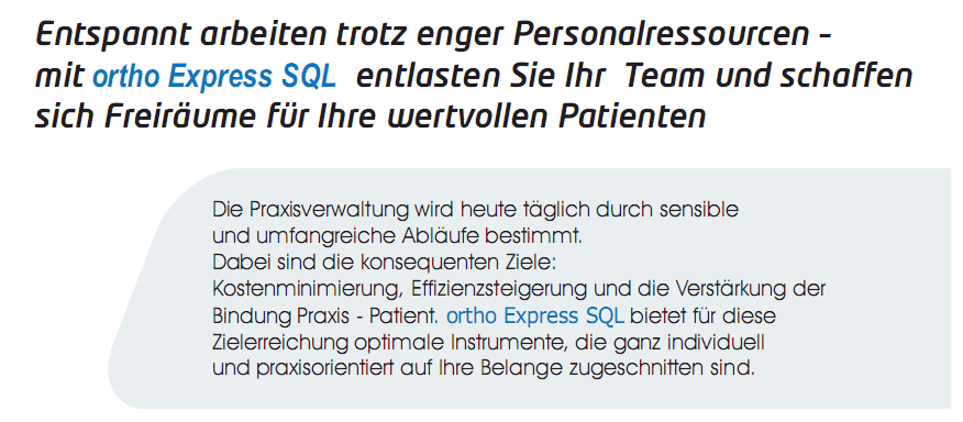 ortho Express verschafft Ihnen mehr Zeit für Ihre wichtigste Aufgaben – die Arbeit mit den Menschen. Das Programm unterstützt Sie bei Ihrer Arbeit und schafft Ihnen zeitliche Freiräume.